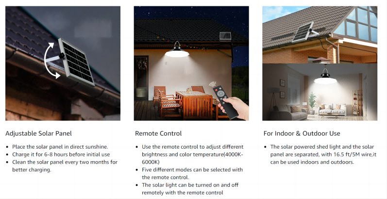 3. IP65 Vattentät och enkel installation Den solcellsbaserade ladugårdsbelysningen för utomhusbruk har en vattentät IP65-design och är ansluten till solpanelen med en 5 meter lång kabel.